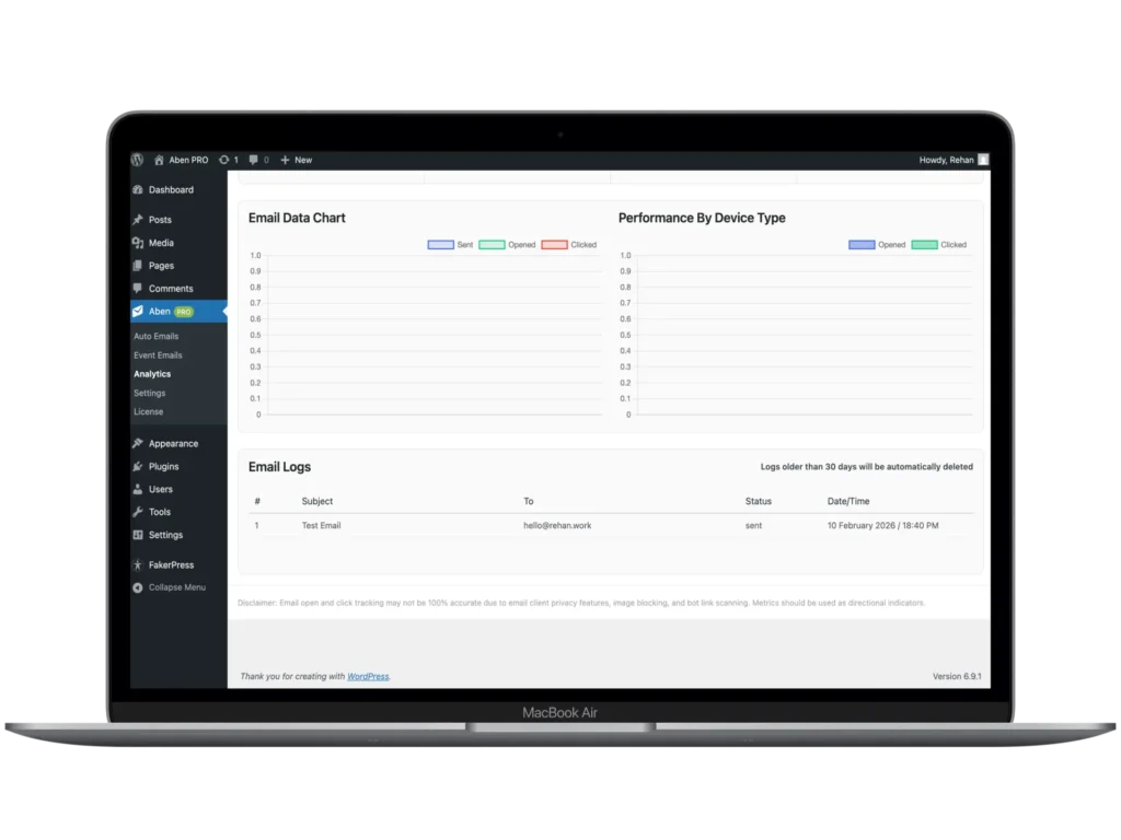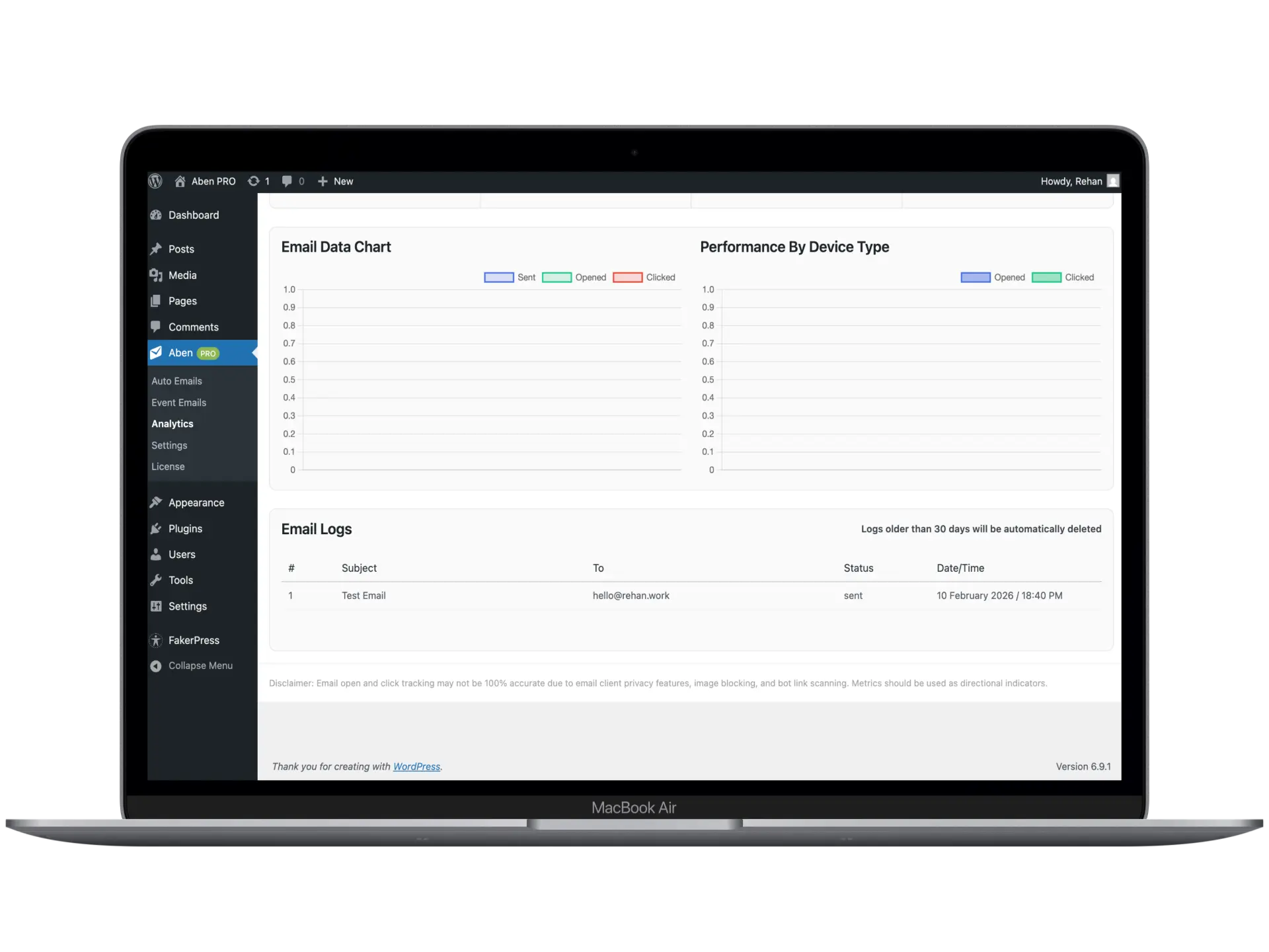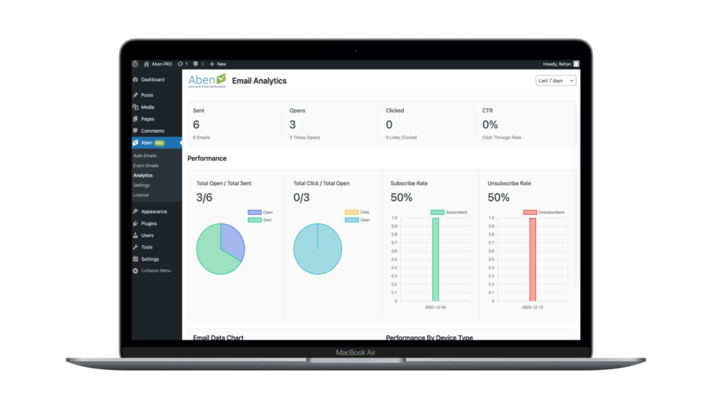 Measure email performance with clear insights into sends, opens, and clicks. View interactive charts, detailed delivery logs, and device-level engagement metrics directly from the admin dashboard.